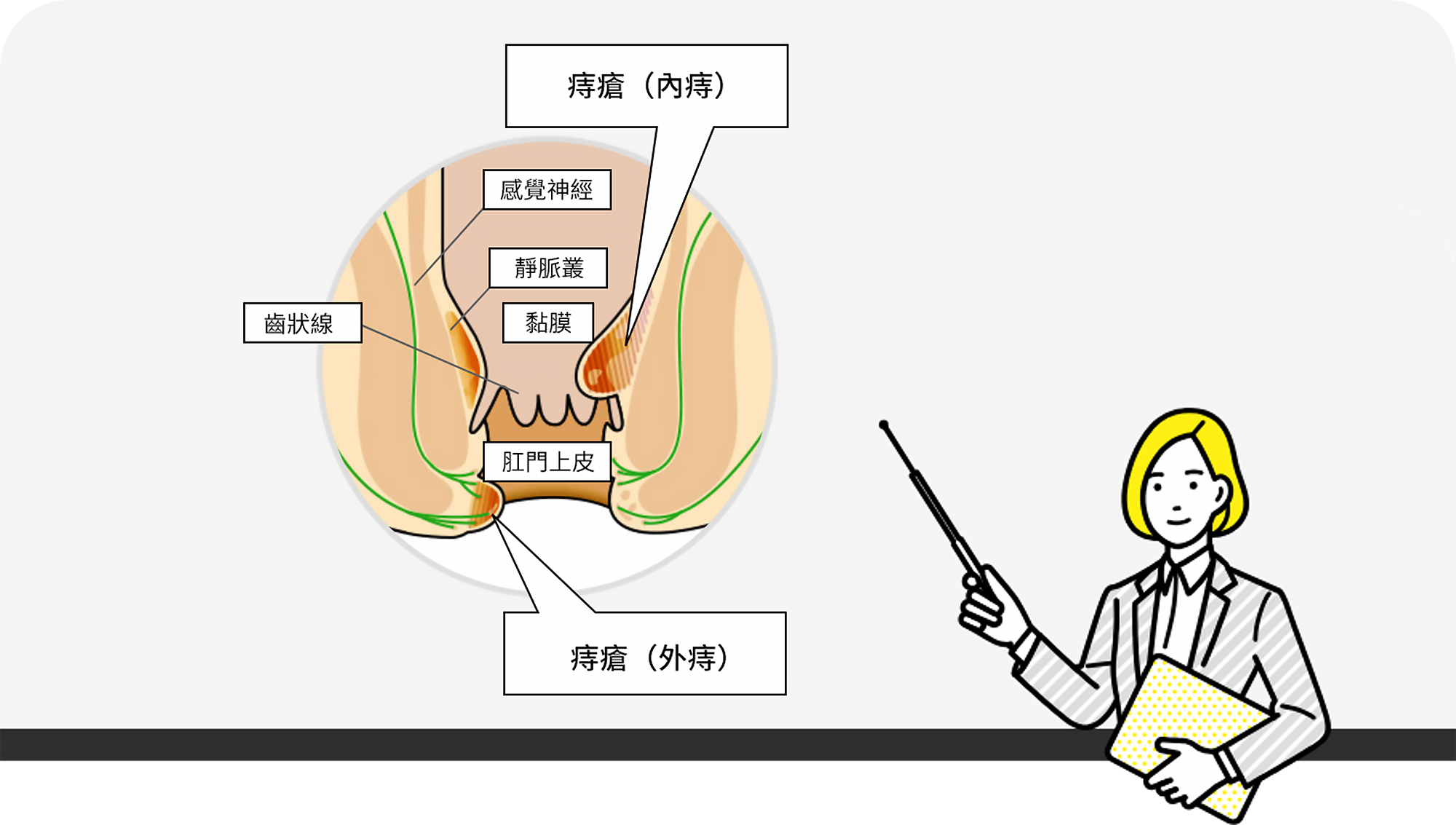 | 外痔 | 發生在肛門外部,靠近皮膚的區域,因神經分布豐富,會出現明顯的刺痛、搔癢或腫塊感,尤其排便後更明顯 |